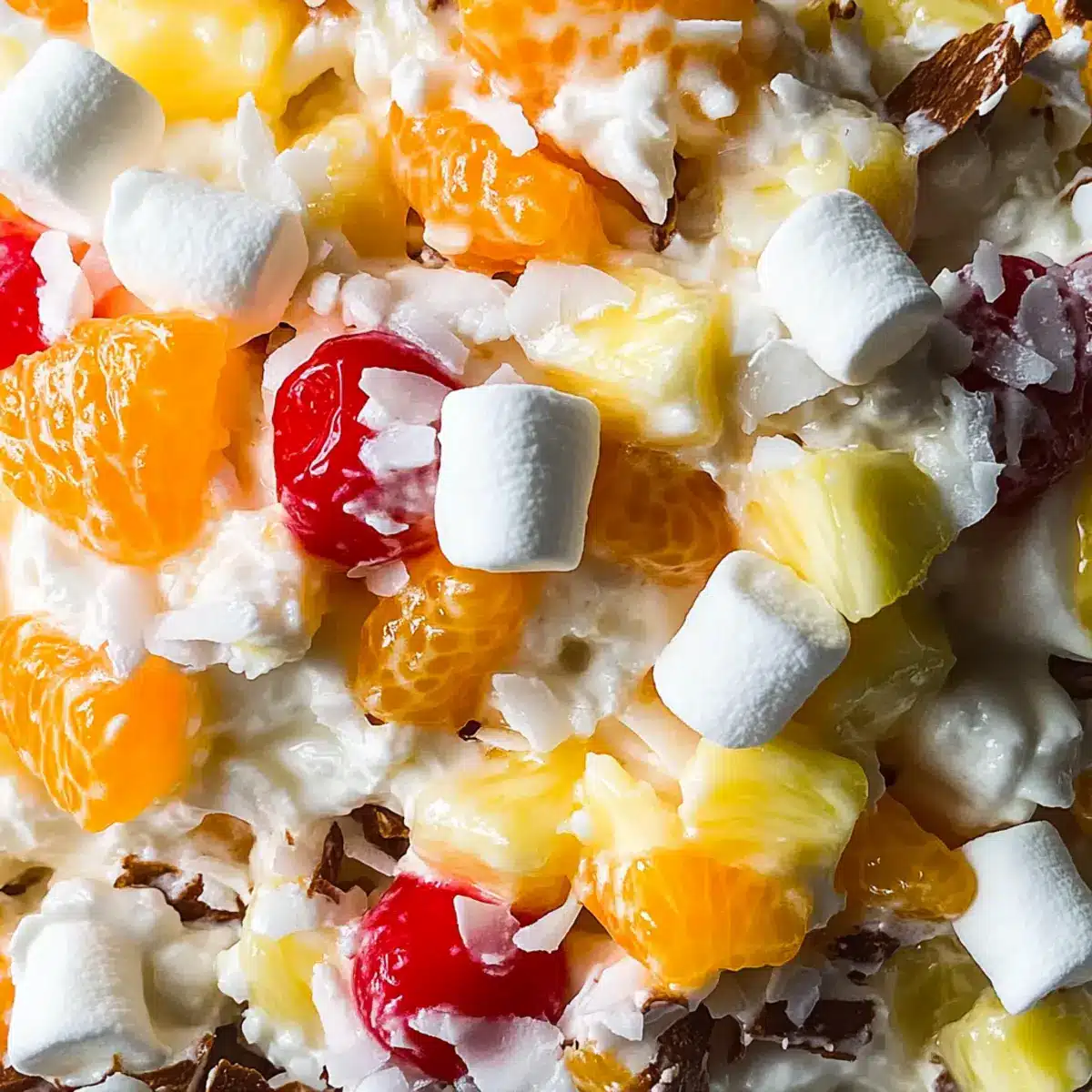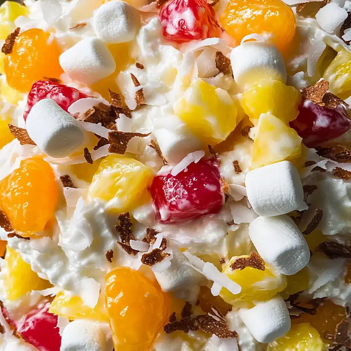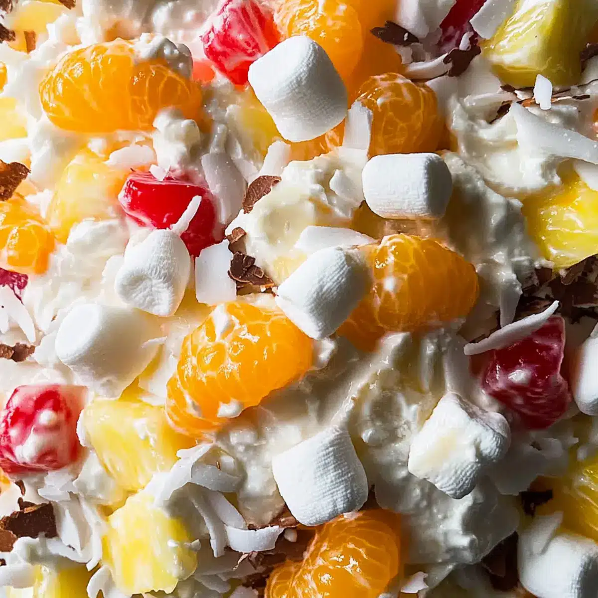 - Fold in mini marshmallows, drained mandarin oranges, chopped pineapple, shredded coconut, and maraschino cherries gently.