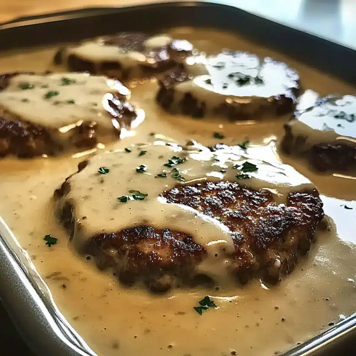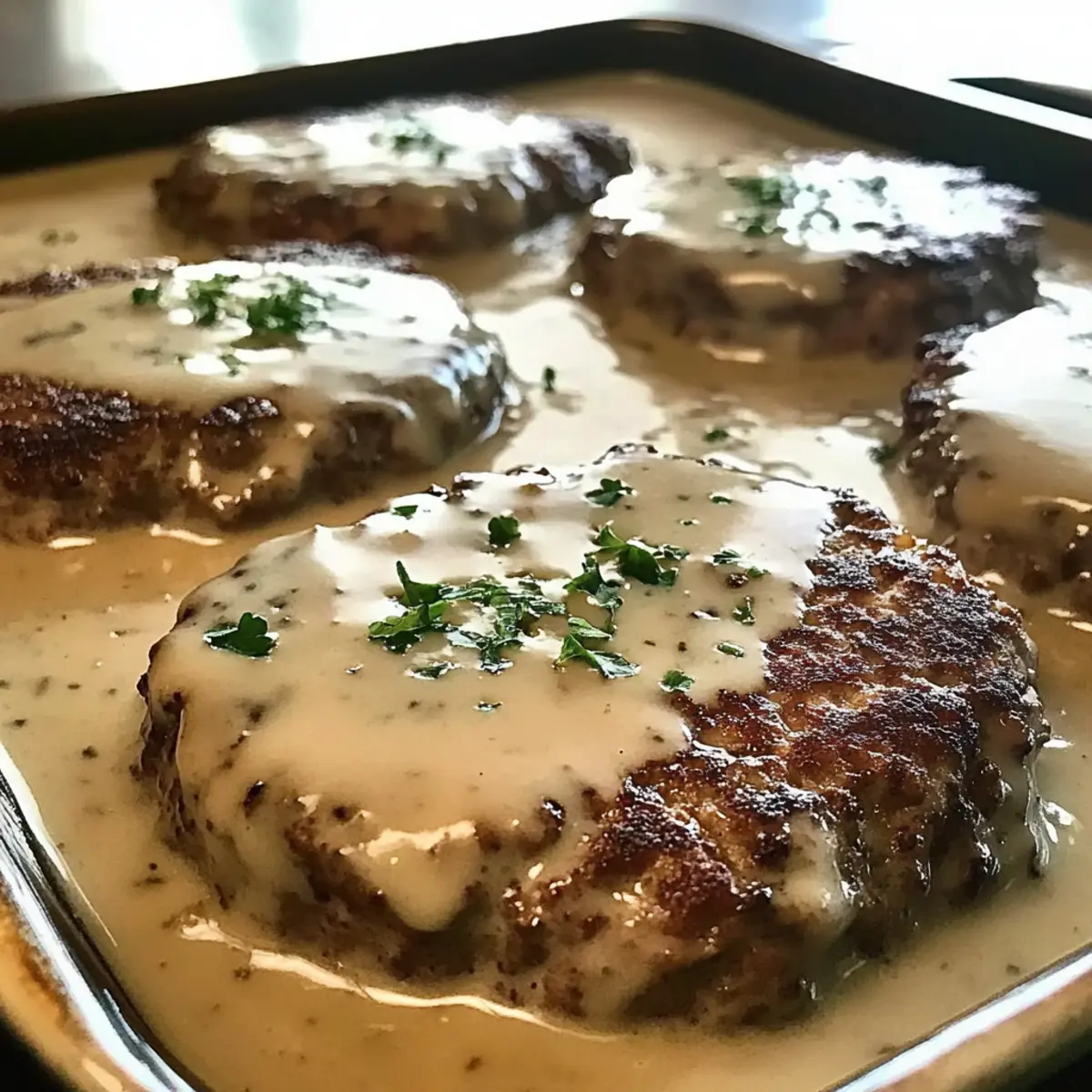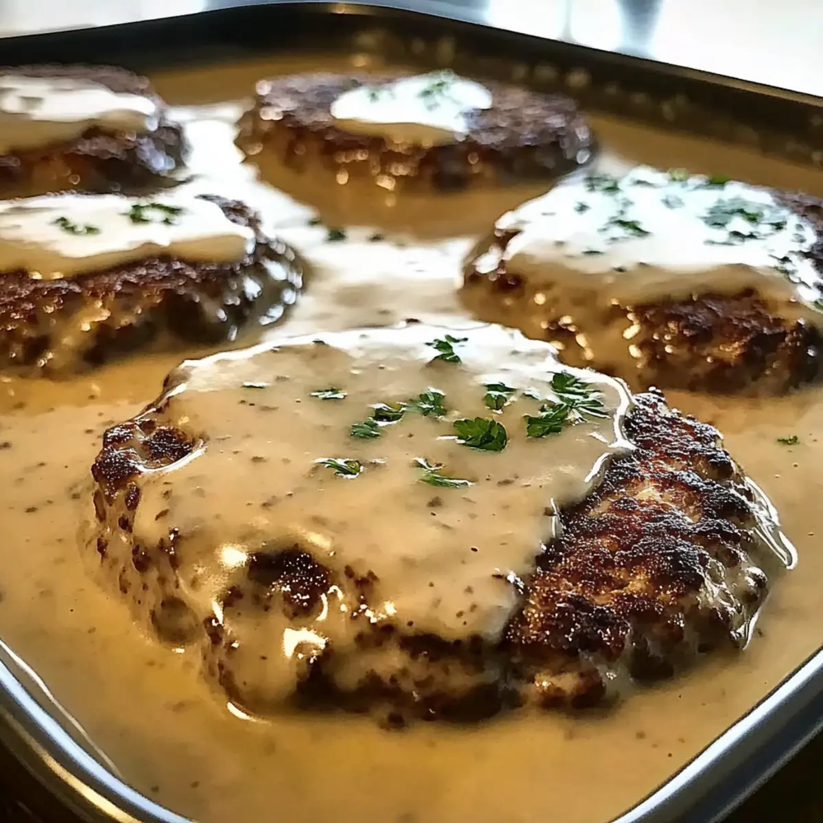 - Nestle the browned hamburger patties into the creamy gravy, ensuring they are submerged. Cover and bake at 350°F for 45 minutes. Uncover and bake for an additional 15 minutes.