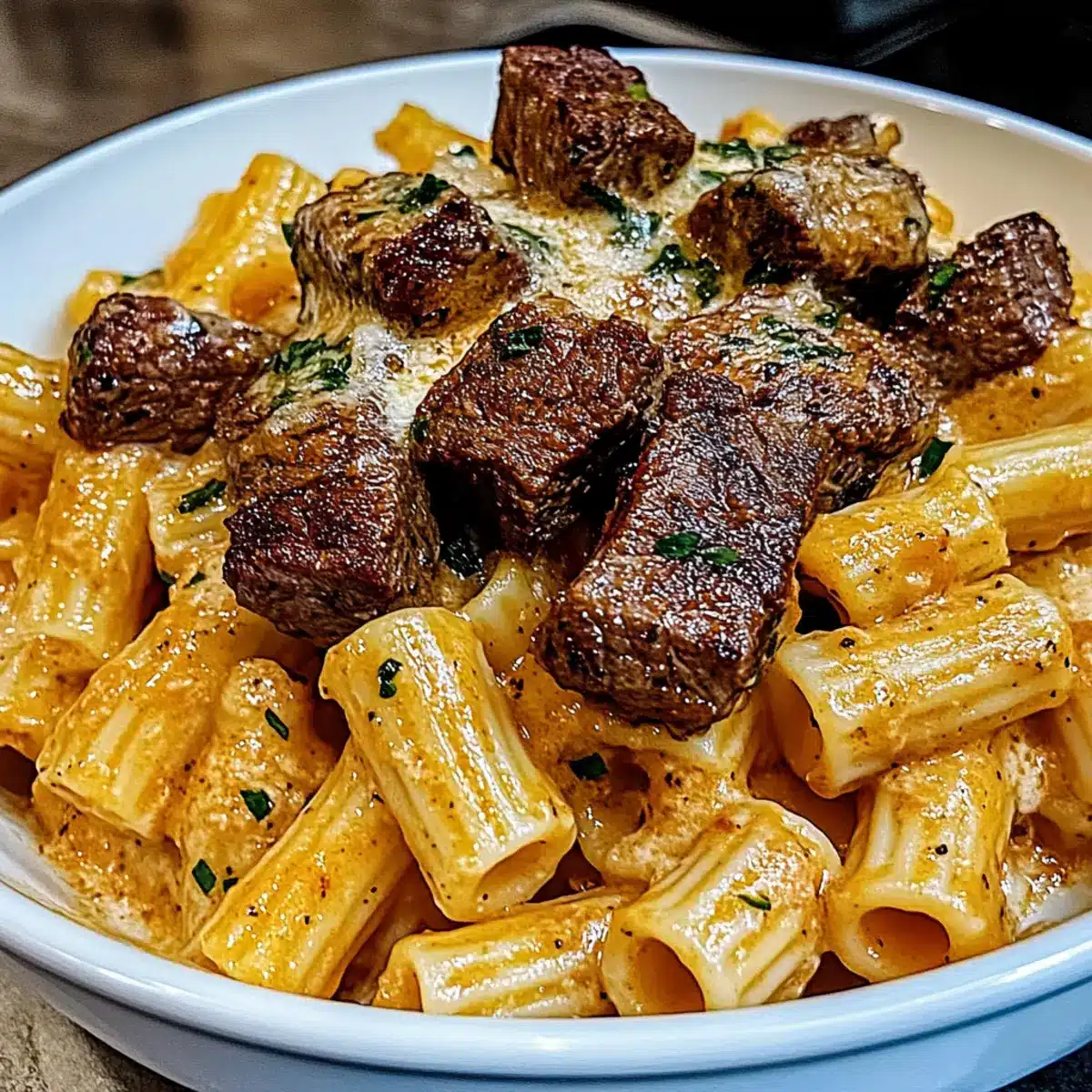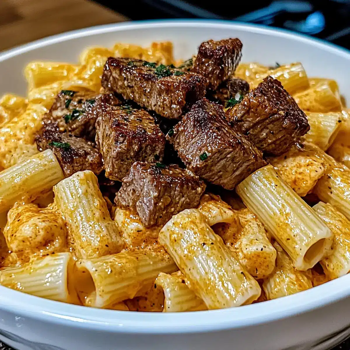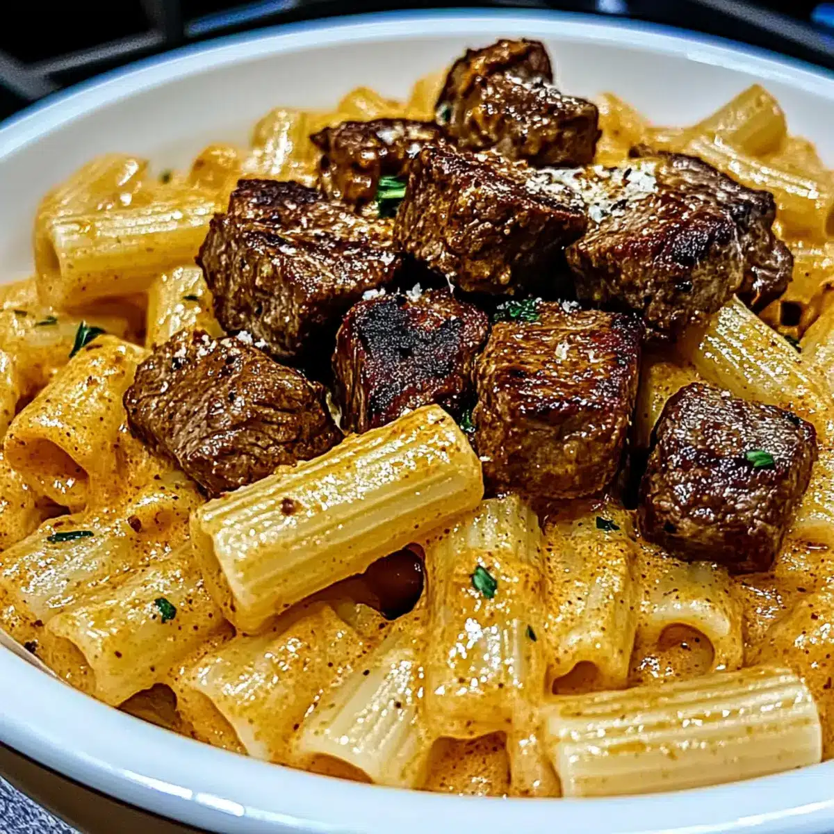 Cajun Steak Tips in Cheesy Rigatoni Parmesan Sauce Bliss