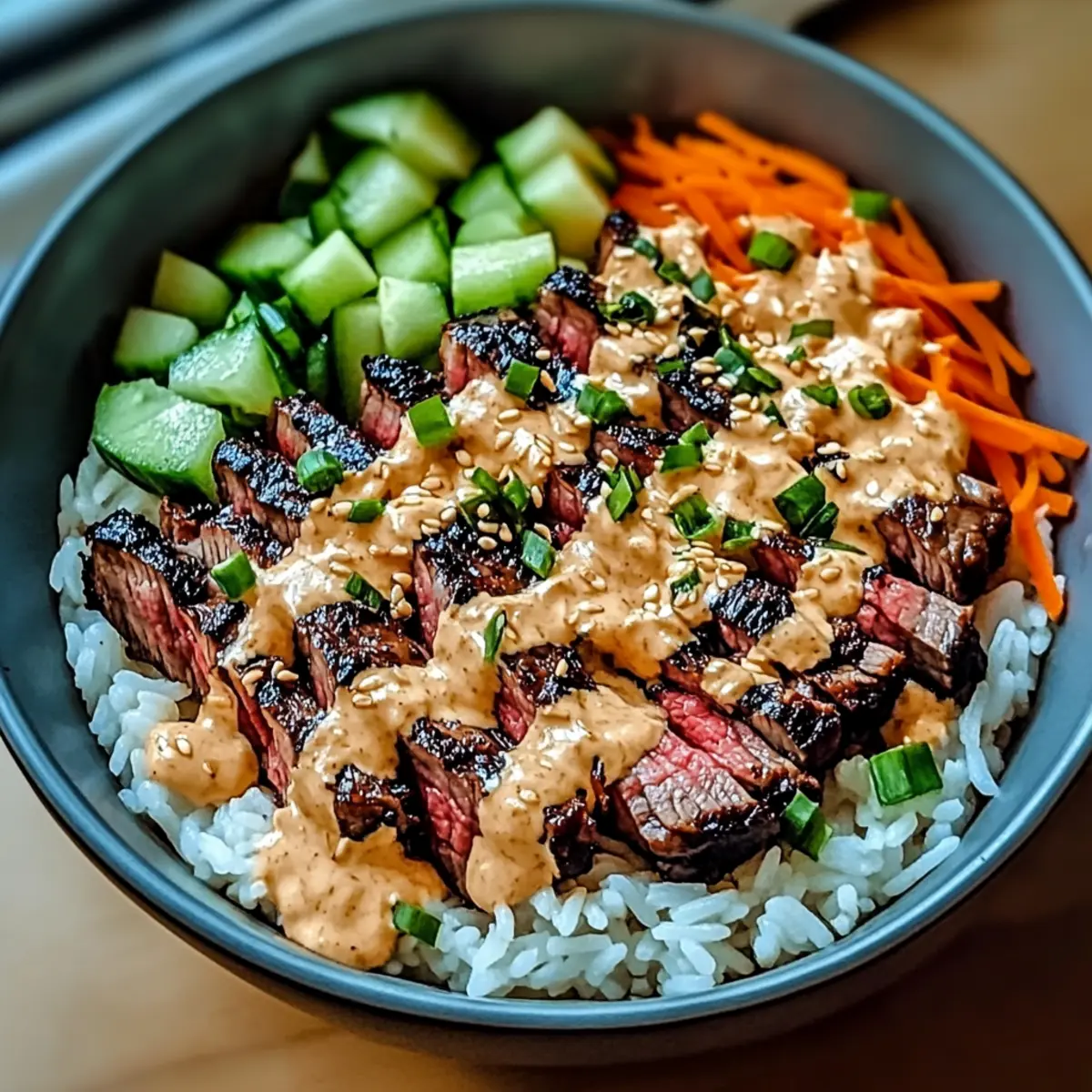 Savor Korean BBQ Steak Rice Bowls with Spicy Cream Sauce Bliss