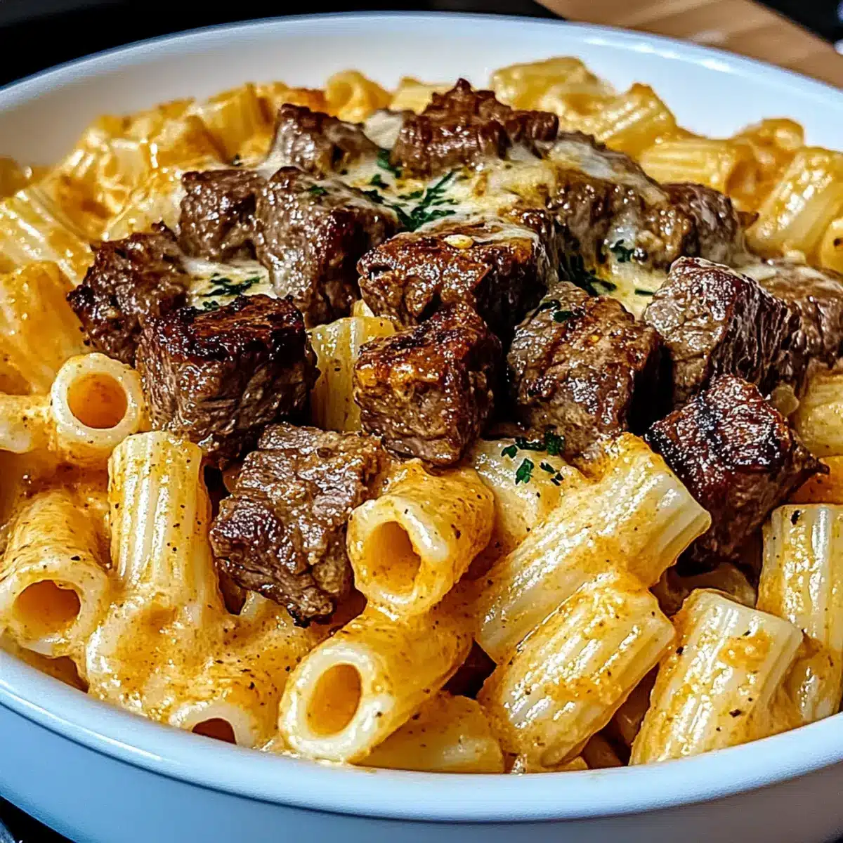 Cajun Steak Tips in Cheesy Rigatoni Parmesan Sauce Bliss
