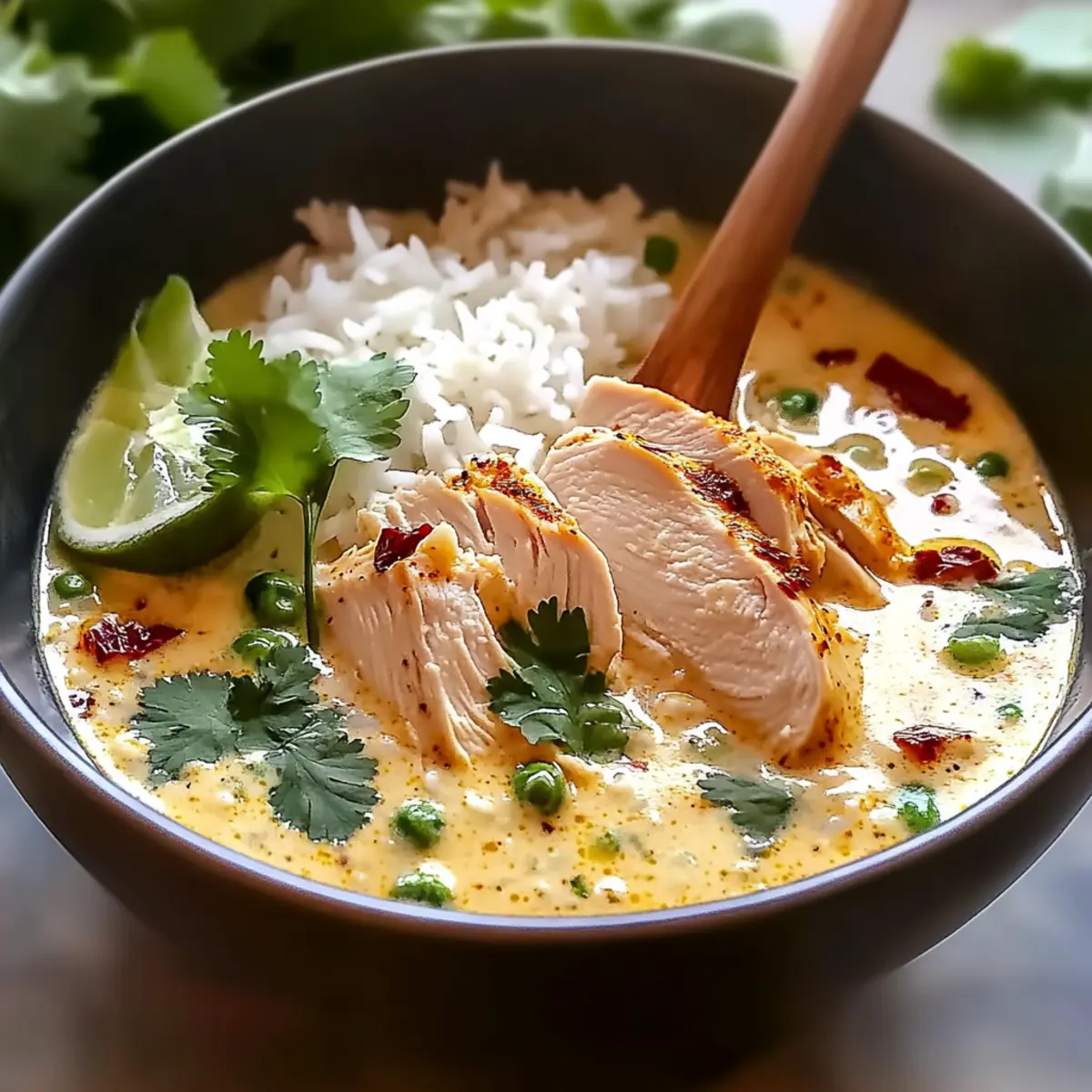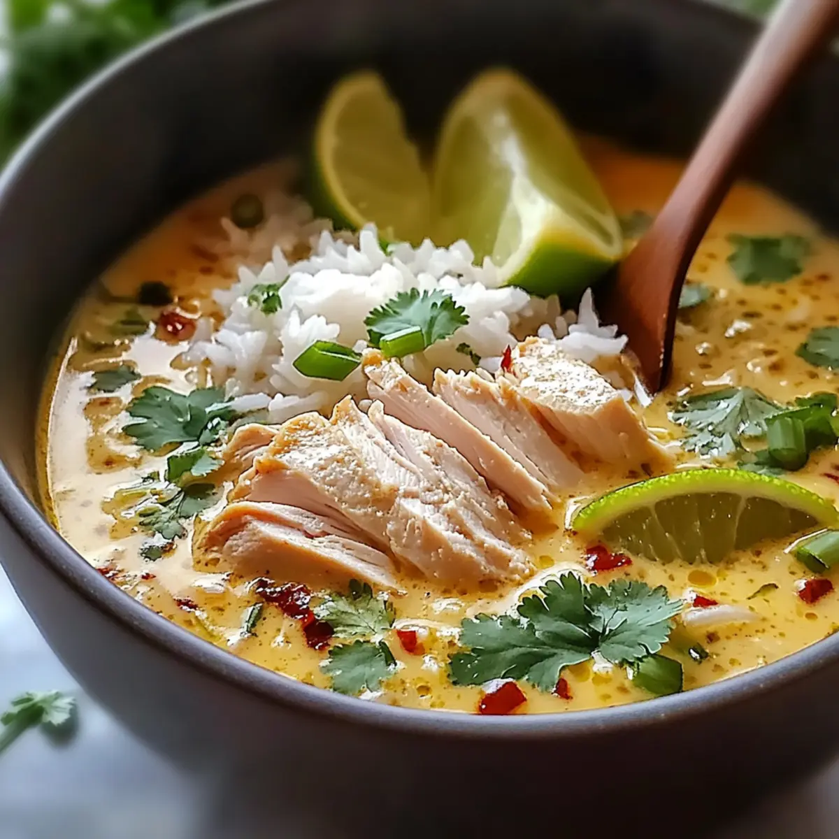 In bowls, layer the fluffy jasmine rice first, then pour the rich coconut chicken broth over the top. Nestle the tender chicken strips within this fragrant haven and garnish with finely chopped green onions and fresh cilantro. For an extra zest, add lime wedges on the side for a delightful burst of flavor that complements the richness of your Coconut Chicken Brothy Rice.