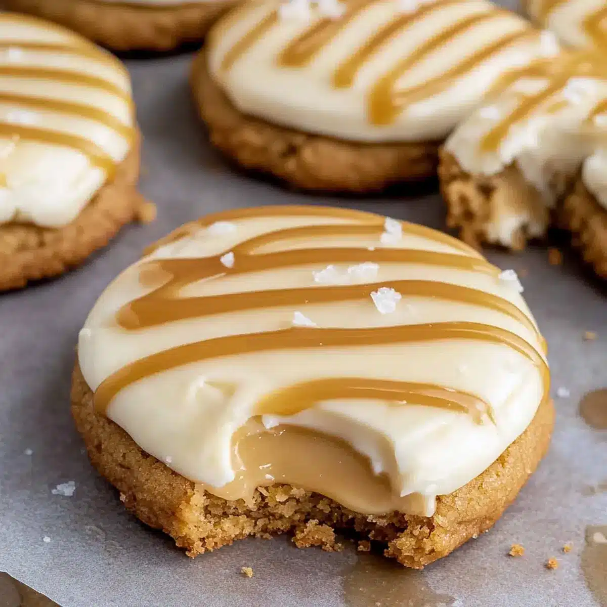 Once the caramel has cooled and thickened, use a spoon or piping bag to drizzle it over the frosted cookies. Allow the caramel to set for about 20-30 minutes at room temperature. This final touch transforms your Copycat Crumbl Salted Caramel Cheesecake Cookies into a show-stopping dessert that’s sure to impress everyone!
