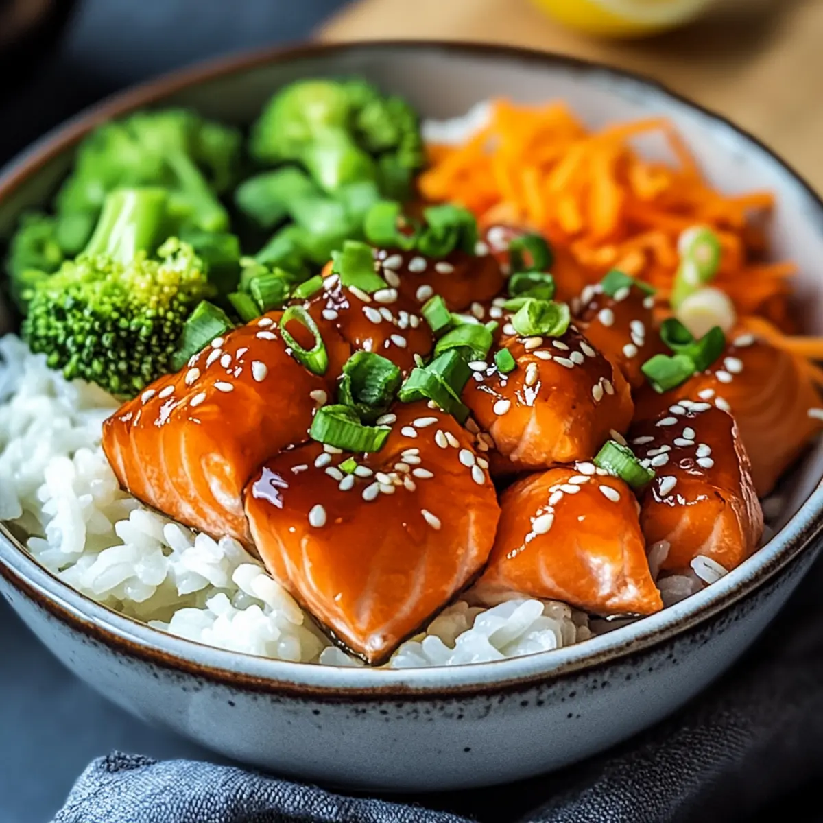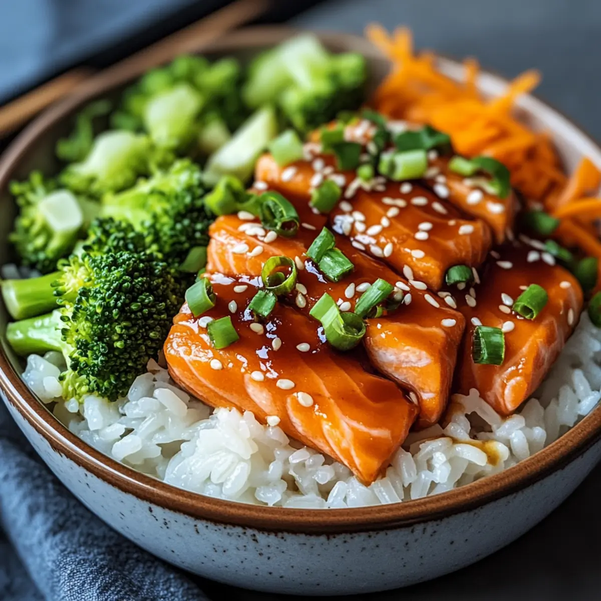 - Assemble your bowl with a scoop of rice, topped with salmon and veggies.
