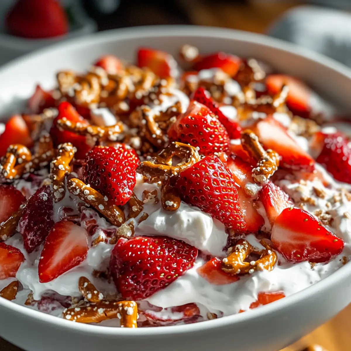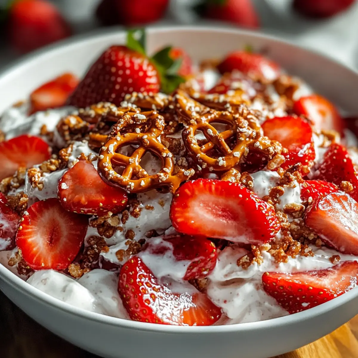 • Crushed Pretzels – Adds a unique crunch and salty contrast to the sweetness of the strawberries. Gluten-free pretzels can be used as a substitute for a gluten-free version.