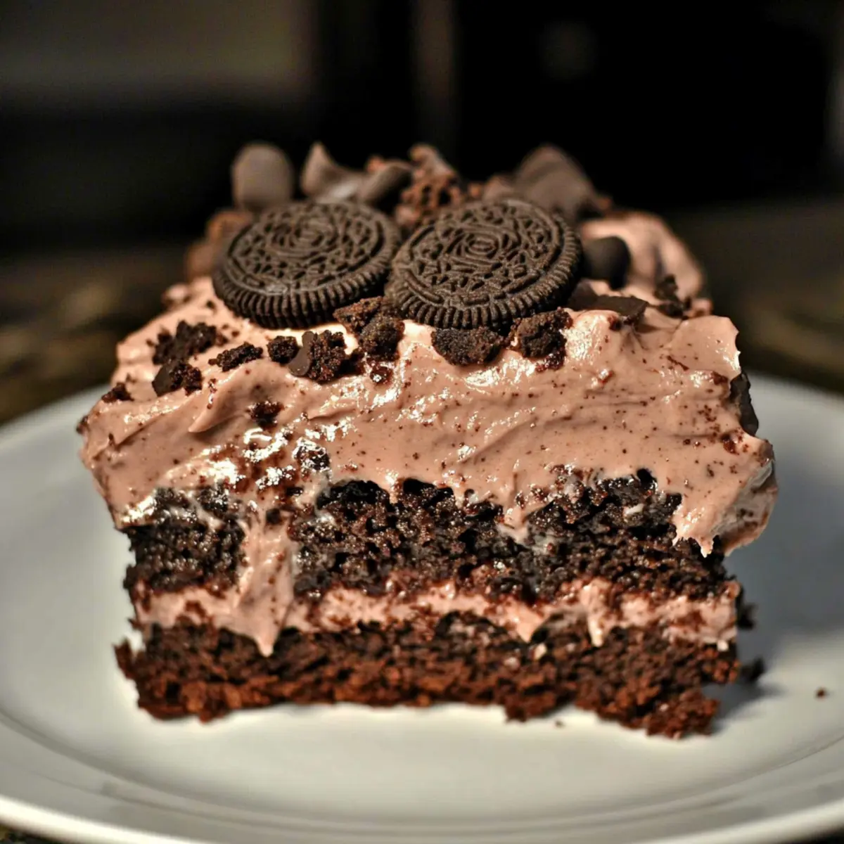 In another bowl, mix the remaining chocolate pudding with milk, then gently fold in the thawed Cool Whip until combined. Add about three-quarters of the crushed Oreos to this mixture for that signature crunch. Spread this delightful topping over the cake, and sprinkle the remaining crushed Oreos on top for an eye-catching finish.