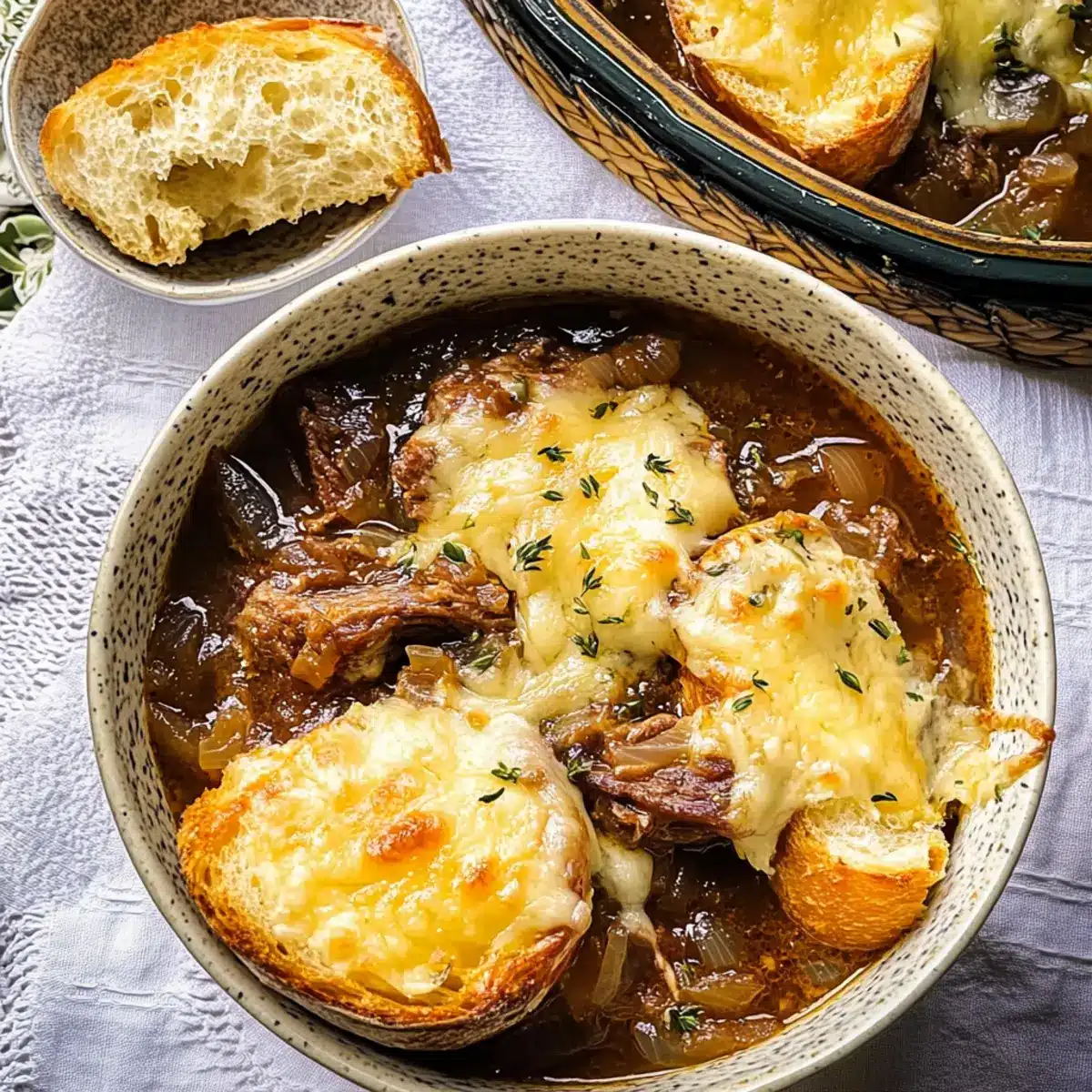 These Hearty French Onion Beef Stew preparations are perfect for busy weeknights, allowing you to enjoy a comforting meal with ease! You can slice the onions and sear the beef up to 24 hours in advance, then store them separately in airtight containers in the refrigerator. The caramelized onions can also be made ahead—just let them cool before refrigerating. When you’re ready to finish the dish, combine the prepped ingredients and simmer, adding the remaining elements as you go. For the ultimate flavor, avoid adding the cheesy bread topping until just before serving, to keep it crispy and delicious. Rest assured, your French Onion Beef Stew will still be just as flavorful!