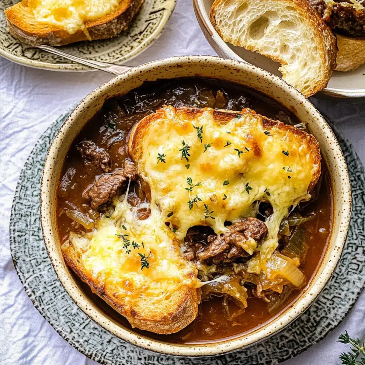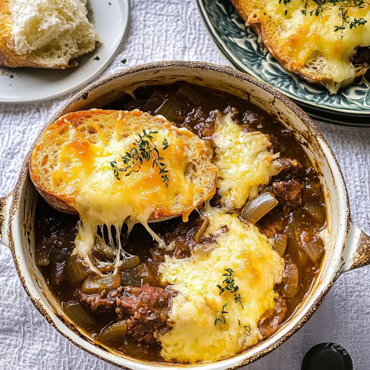 As the aroma of simmering beef and sweet onions wafts through the kitchen, I can’t help but feel a comforting warmth wrap around me like a soft blanket. Today, I’m excited to share my Hearty French Onion Beef Stew with Cheesy Bread Topping—a perfect embrace on a chilly evening. This delightful dish combines the richness of a classic beef stew with the familiar flavors of French onion soup, creating a meal that not only comforts but also pleases a crowd. It’s surprisingly simple to prepare, making it a fantastic option for busy weeknights or relaxed weekend gatherings. With tender beef, luscious caramelized onions, and a cheesy bread topping that melts in your mouth, this hearty stew is sure to impress. Ready to find out how to make this cozy masterpiece? Let’s get cooking!