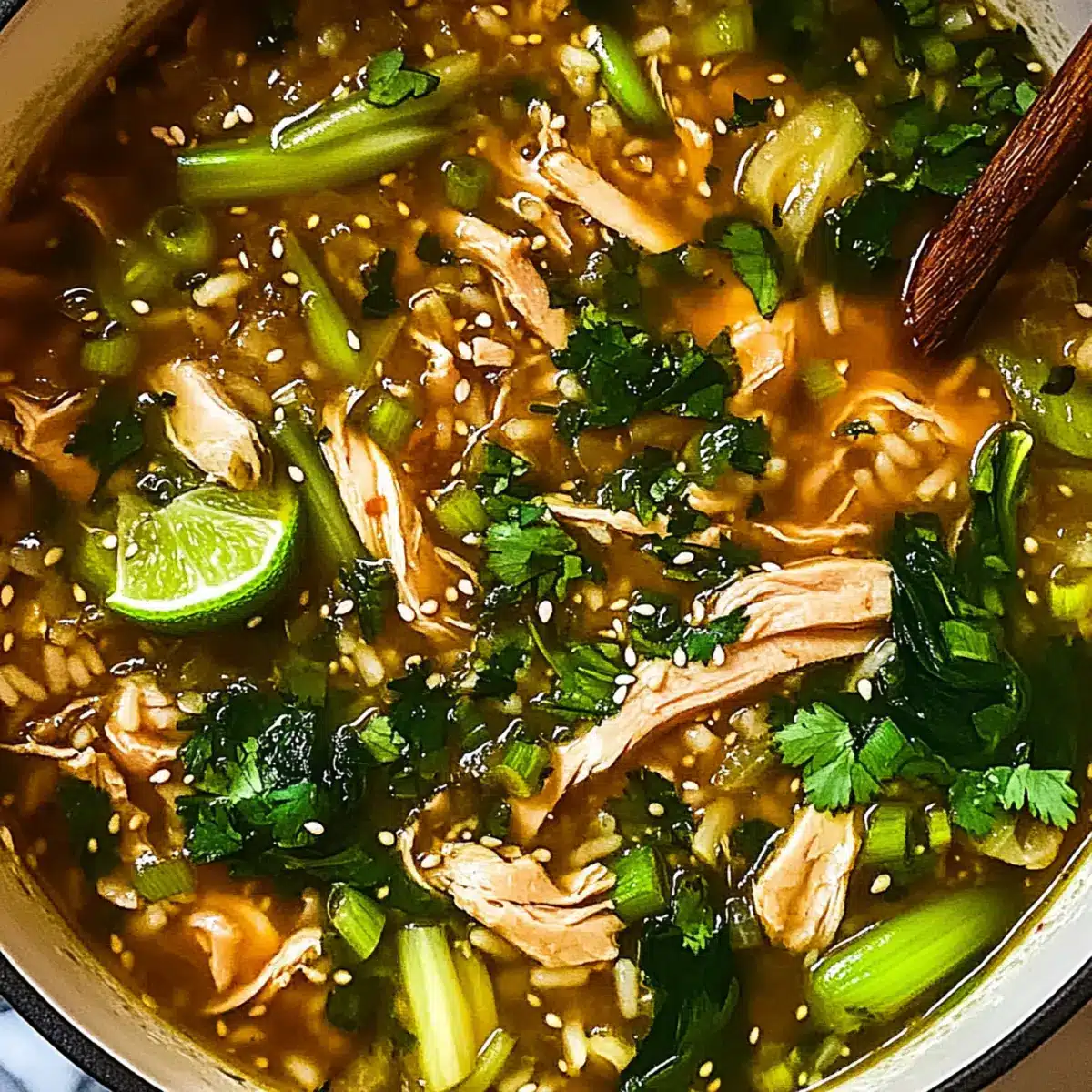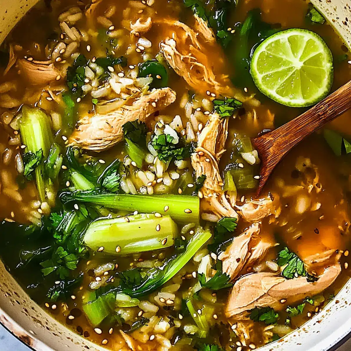 Ladle the steaming Ginger Chicken and Rice Soup into bowls and garnish with toasted sesame seeds, fresh cilantro, and a drizzle of chili oil for a touch of heat. Don’t forget to serve with lime wedges on the side to add a refreshing zest just before each spoonful.