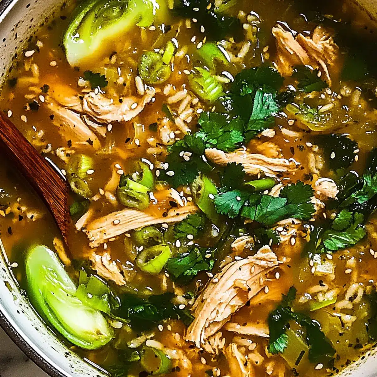 Stir in 2 cups of chopped baby bok choy and the green parts of 3 green onions into the soup. Allow the mixture to simmer uncovered for an additional 3–4 minutes until the bok choy becomes tender and vibrant, creating a visually enticing finish to your Ginger Chicken and Rice Soup.