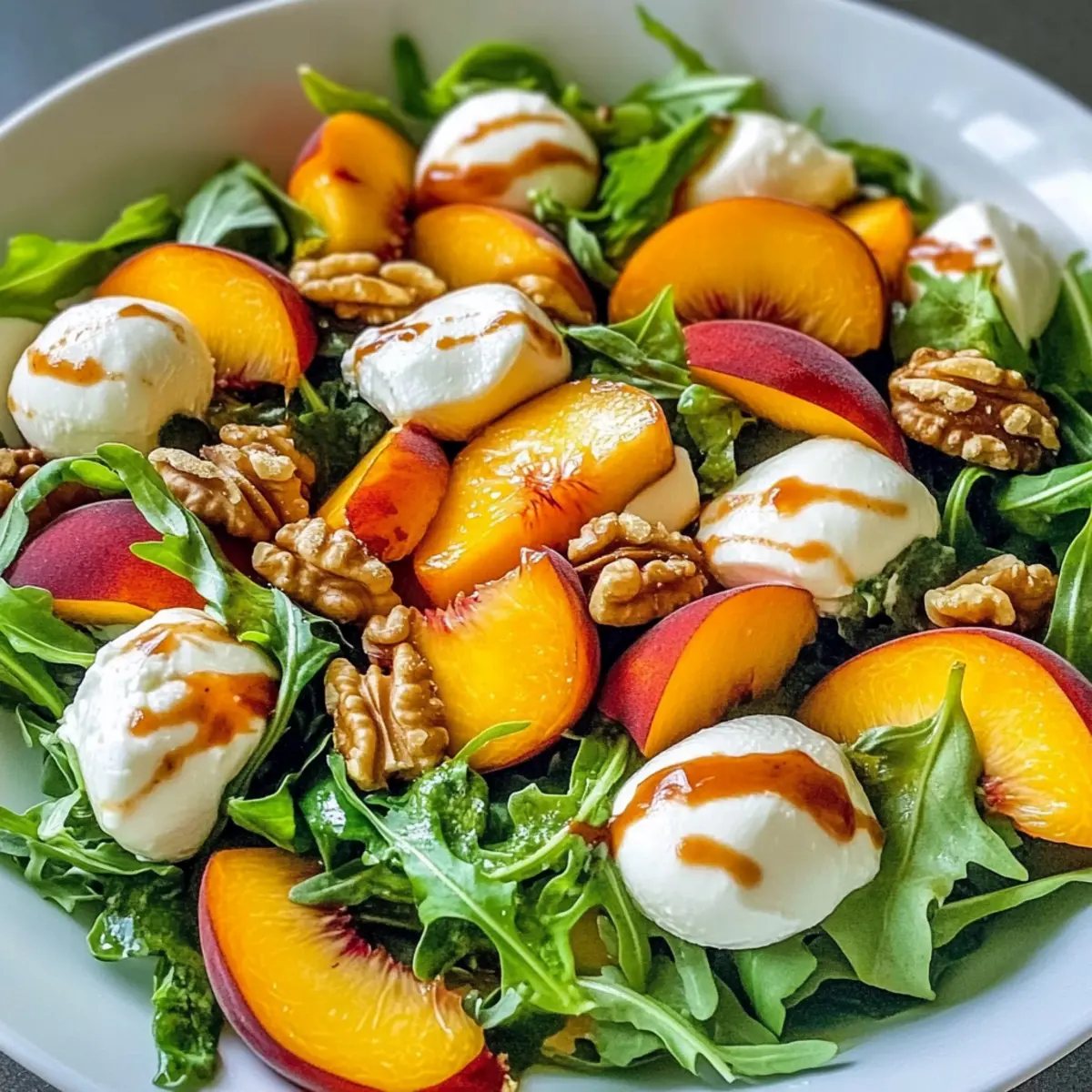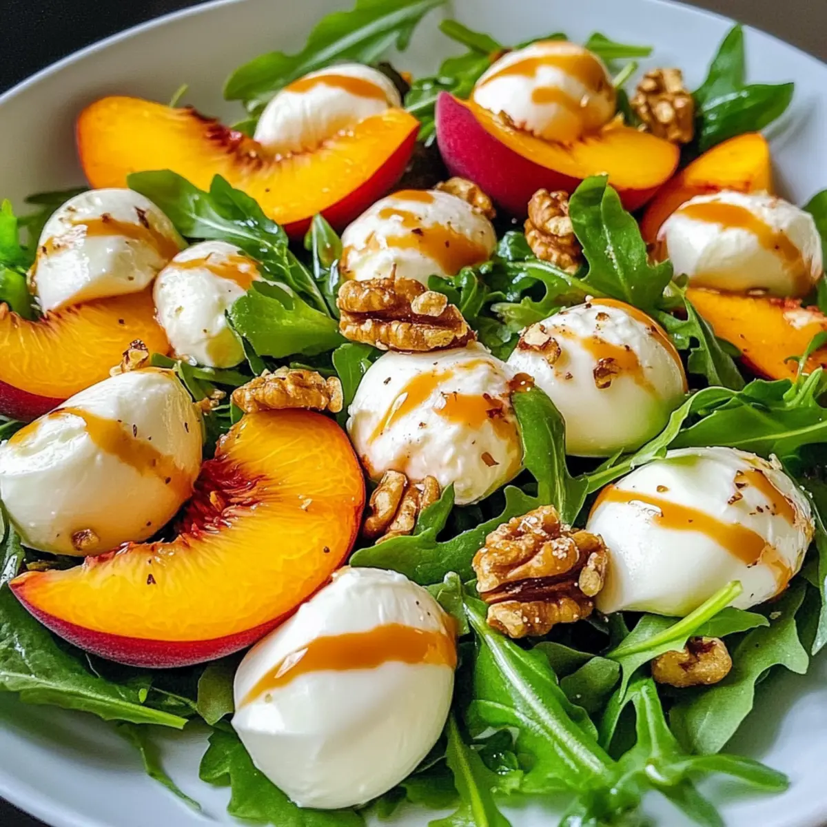 Vibrant Ingredients: The colorful combination of ripe peaches, creamy mozzarella, and crunchy walnuts creates a feast for both the eyes and the palate.