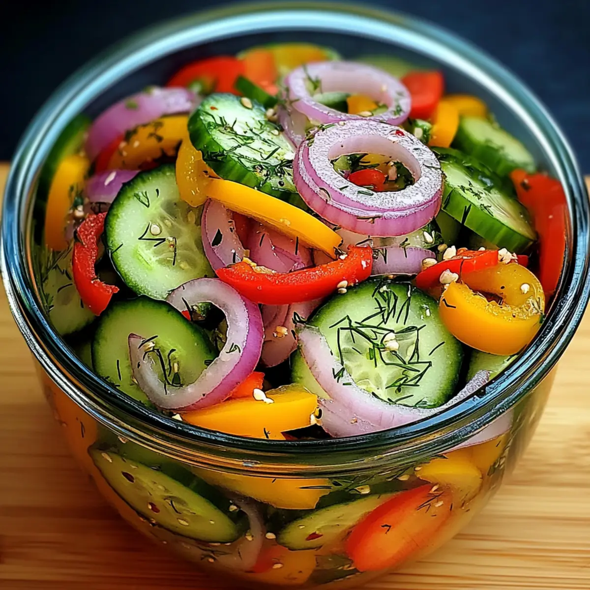 As I rummaged through my fridge one sweltering afternoon, I stumbled upon a rainbow of vegetables begging to be transformed into something deliciously simple. That’s when the idea of a refreshing Pickled Cucumber, Onion, and Bell Pepper Salad came to mind. This salad offers a burst of vibrant colors and flavors, making it a fantastic choice for summer barbecues or a casual dinner at home. With only 15 minutes of prep and no cooking required, it’s a breeze to whip up. Plus, you can feel great about serving a family-friendly dish that won’t break the bank, all while making the most of seasonal produce. What fresh twist will you put on this invigorating salad?