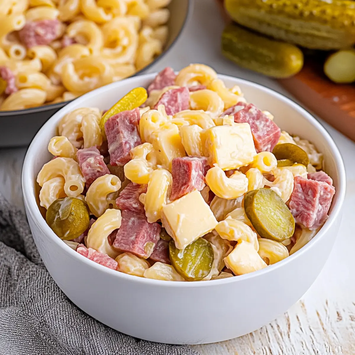 - Prepare the Salad Ingredients: In a mixing bowl, combine cooled macaroni, corned beef, Swiss cheese, sauerkraut, and dill pickles. Gently fold to distribute ingredients.