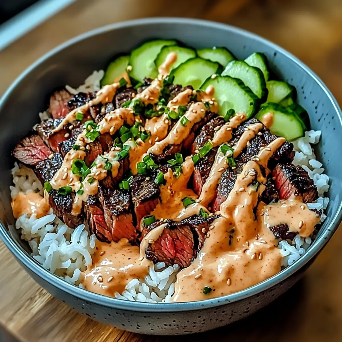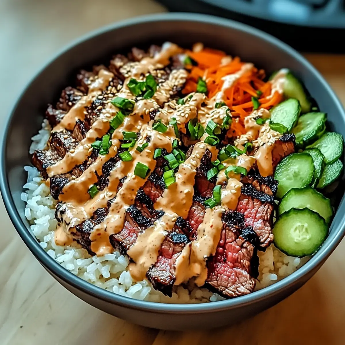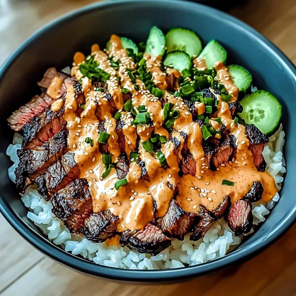 Savor Korean BBQ Steak Rice Bowls with Spicy Cream Sauce Bliss