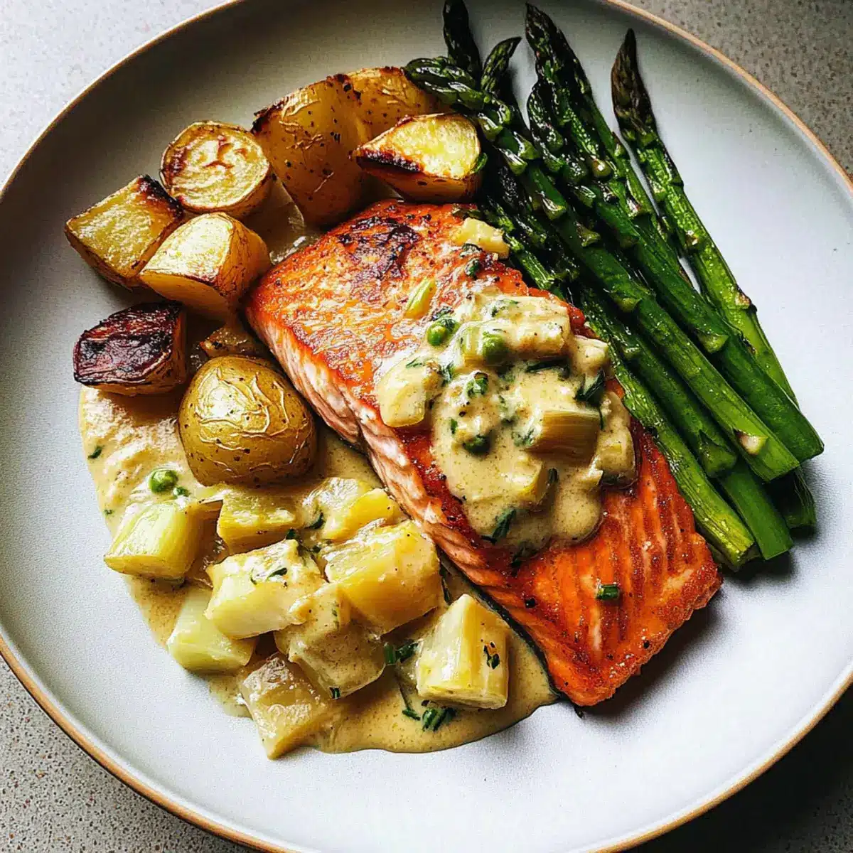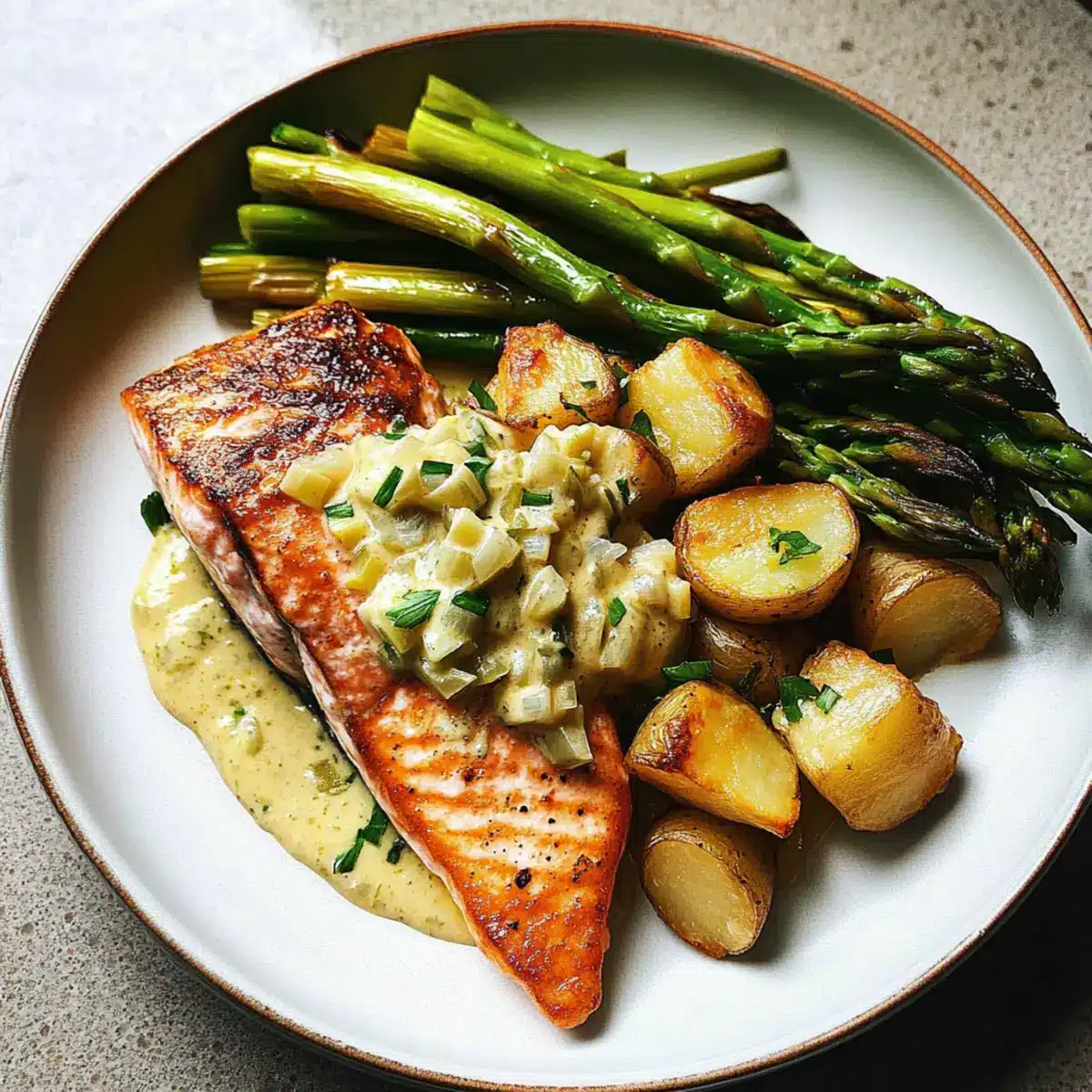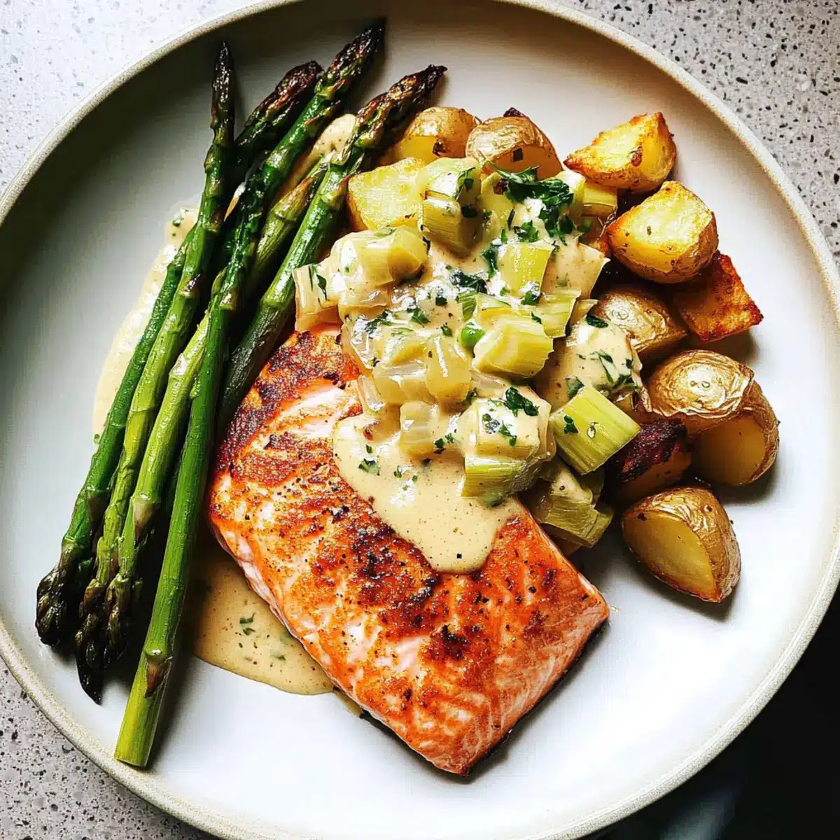 Once everything is cooked, grab a plate and layer the crispy potatoes as the base. Generously spoon the creamy leeks over the potatoes, allowing the richness to soak in. Top with the seared salmon fillets and arrange the roasted asparagus beside them. This creates a beautiful presentation, showcasing the stunning colors in your Spring Salmon with Creamed Leeks dish.